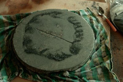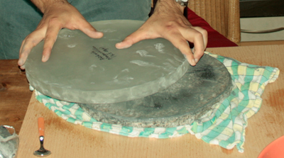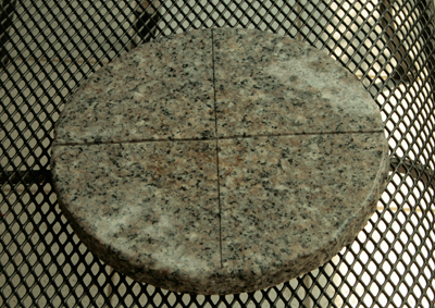 Das Schleiftool ist eine 30cm Trittplatte aus Granit, 30mm stark, das sie auf der einen Seite etwas angeschlagen war, kostete sie im WieWoWas-Baumarkt nur noch 2 €. Mit einer Schruppscheibe für Stein wurde sie etwas vorgeschliffen, eine Fase angebracht und mit der Trennscheibe eine Kerbe gezogen: