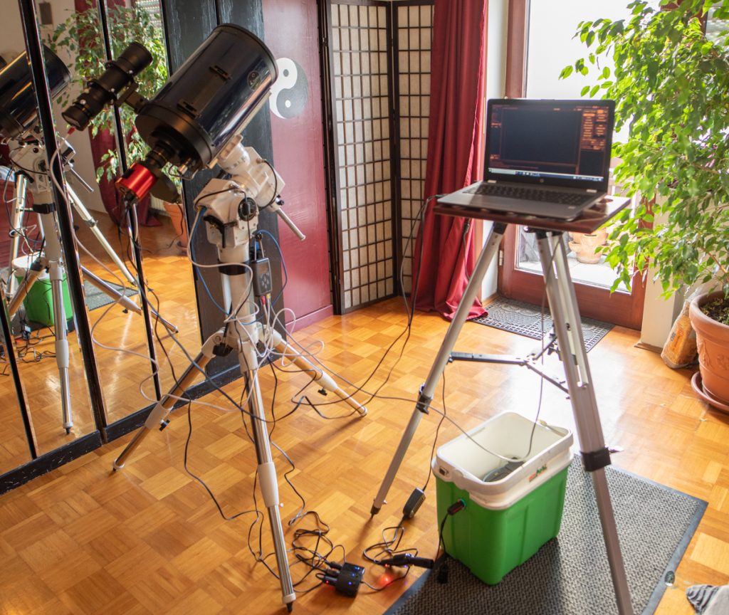 Die zentrale Aufnahmesteuerung erfolgt über APT (AstroPhotoTool), Kamera, Filterrad und Montierung werden über Ascom eingebunden, der MGEN wird von APT nativ unterstützt. Als Sternkarte von APT aus nutzbar ist Stellarium und Cartes de Ciel installiert. Für Planetenaufnahmen außerdem noch SharpCap.