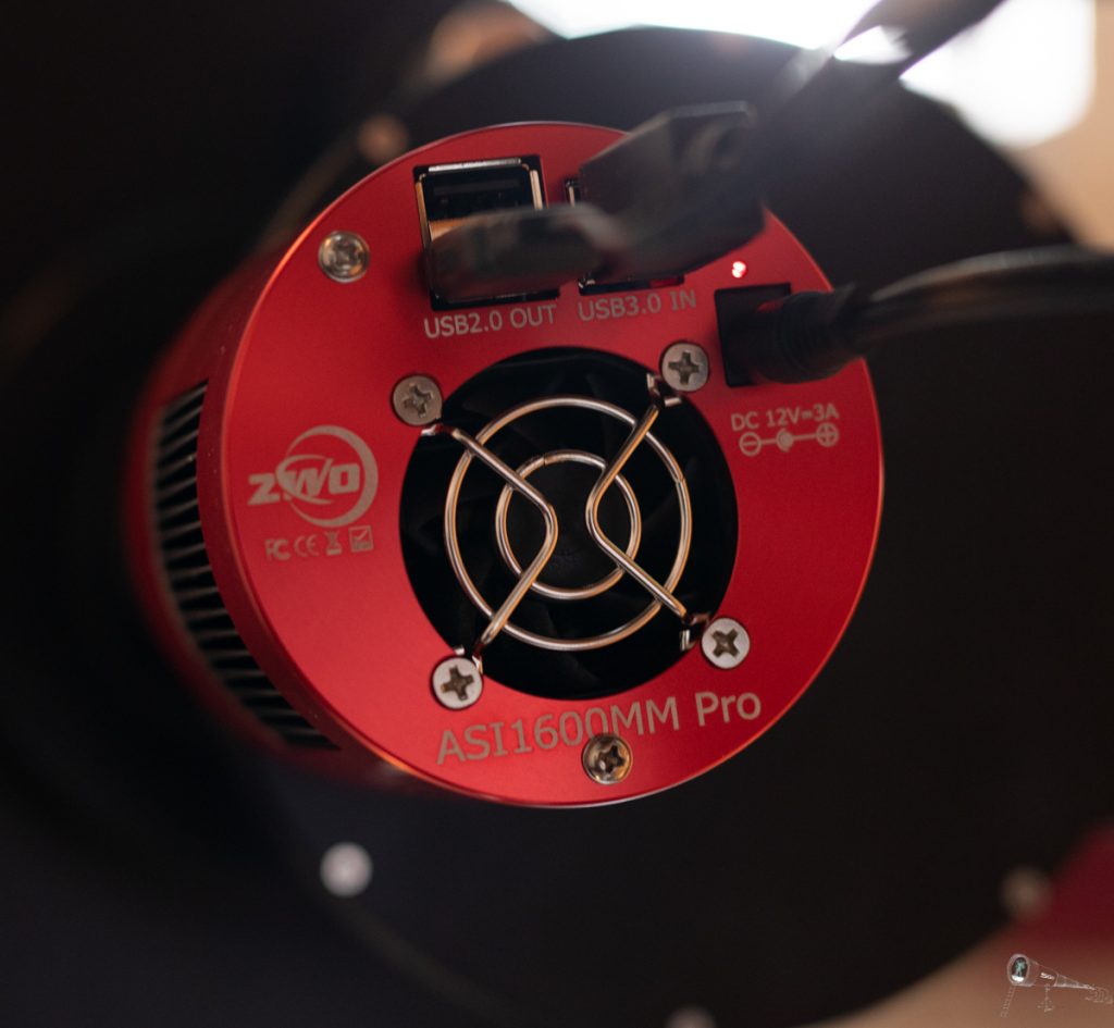 Als neue Kamera werkelt die ASI1600mm pro, eine gekühlte Monochrom-CMOS-Kamera von Zwo optical. Sie kann bis 45° C unter Umgebungstemperatur gekühlt werden. An Bord werkelt ein Panasonic MN34230 CMOS-Chip im 4/3″ Format mit 16 Megapixeln Auflösung und 3,8µm großen Pixeln. Steuerung und Aufnahme erfolgt über ein Notebook via USB 3.0.
